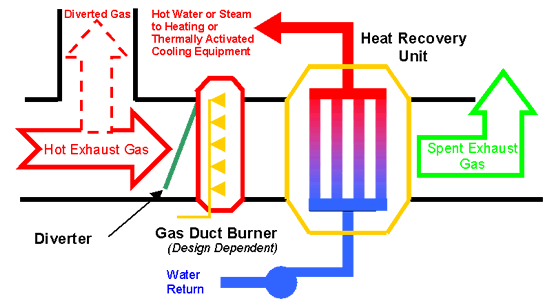Many of the waste heat recovery technologies used in building co/trigeneration systems require hot water, some at moderate pressures of 15 to 150 psig. In the cases where additional steam or pressurized hot water is needed, it may be necessary to provide supplemental heat to the exhaust gas with a duct burner.